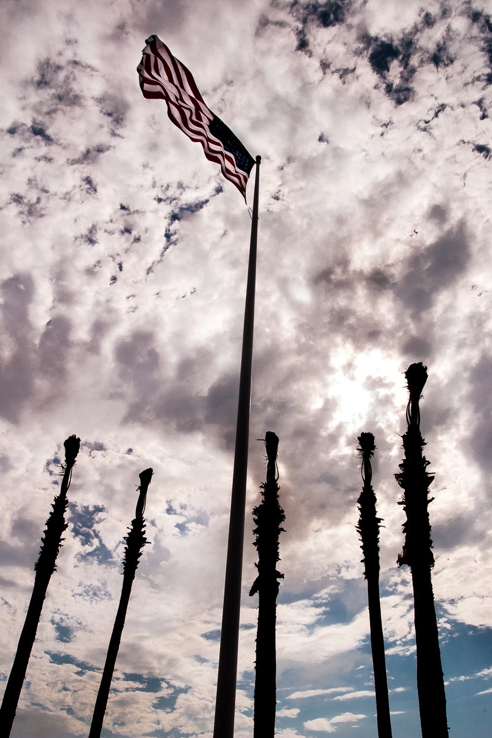 I have always been fascinated by palm trees when they get moved. First, they have to dig them up and then crop off most of the fronds. Then they tie them together so the tree looks like a very long paint brush.I still have one of my first palm tree photos framed in my studio. I shot it in Palm Springs with my first SX 70 camera back in 1978 or so. Whenever I run across these trees and there is interesting light going on I just can’t help myself, I have to stop and make a photo. This was one of those times. The American Flag is another iconic symbol I never tire of using in my images. In this case the flag adds to the composition and then spins a loop around the top of the frame when all of a sudden, the tall paint brush has a red white and blue flag flying. This is a study in composition and weight of a photograph. 5 trees and one flagpole. Heavy bottom light top. Simple linear composition with a solid middle line.